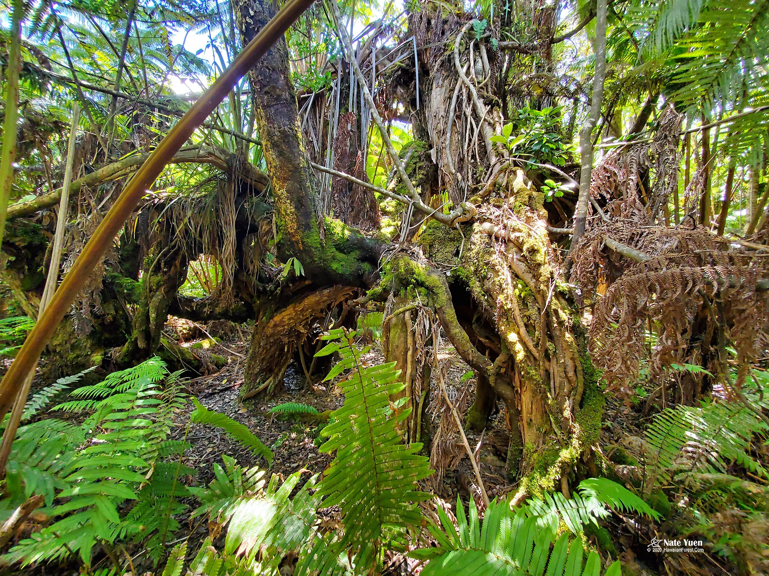 Strong wind toppled a large ʻōhiʻa tree long ago and its stout branches propped the main trunk off the ground at an angle. ʻŌhiʻa and other seedlings sprouted on the fallen tree as epiphytes along with ferns and mosses. The trunks of different trees intertwine and their roots snake down to the ground. It is fascinating to see the unique bark textures of different tree species in the complex.